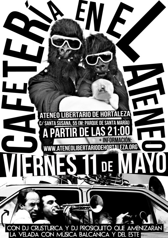 [Viernes 11 de mayo] Cafetería en el Ateneo This entry was posted on 8 de mayo de 2012, in Actividades en el Ateneo. Bookmark the permalink. A partir de las 21:00, cafetería en el local amenizada con música balcánica, por la autogestión del proyecto. ¡Anímate! Comparte esto: Haz clic para compartir en X (Se abre en una ventana nueva) X Haz clic para compartir en Facebook (Se abre en una ventana nueva) Facebook Me gusta Cargando... Relacionado