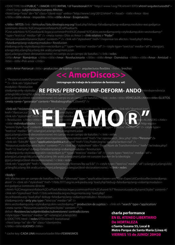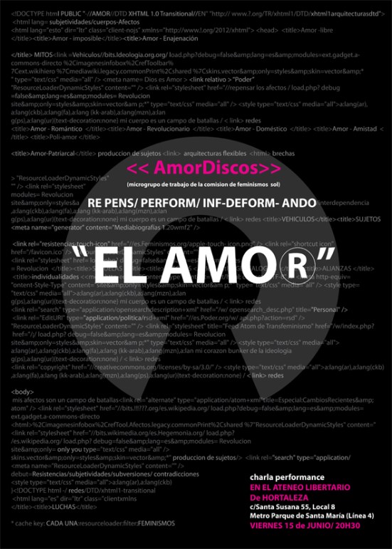 [Viernes 15 de junio] Charla-performance: «Repensando el amor» This entry was posted on 5 de junio de 2012, in Actividades en el Ateneo. Bookmark the permalink. «AmorDiscos» (microgrupo de trabajo de la comisión de feminismo de sol) RE PENS/ PERFORM/ INF-DEFORM-ANDO «EL AMOR» Charla-performance en el Ateneo Libertario de Hortaleza Viernes 15 de junio – 20:30 Comparte esto: Haz clic para compartir en X (Se abre en una ventana nueva) X Haz clic para compartir en Facebook (Se abre en una ventana nueva) Facebook Me gusta Cargando... Relacionado