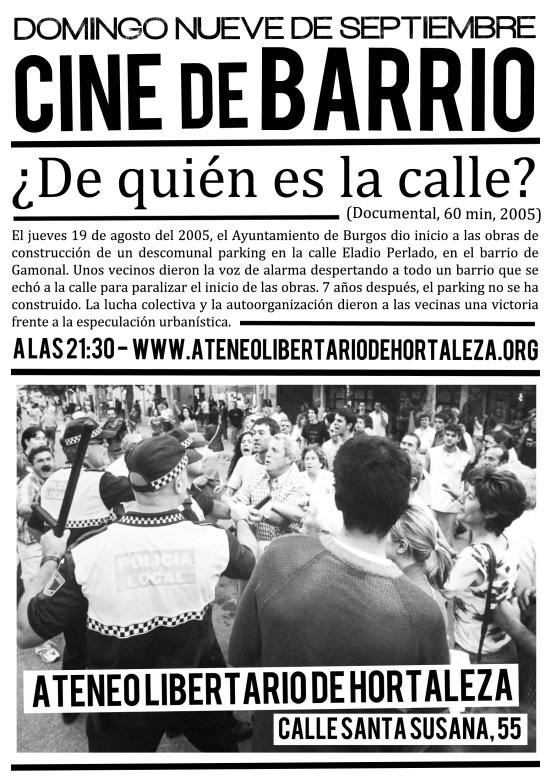 Proyección 9 de septiembre: ‘¿De quién es la calle?'(2005) This entry was posted on 5 de septiembre de 2012, in Actividades en el Ateneo. Bookmark the permalink. Comparte esto: Haz clic para compartir en X (Se abre en una ventana nueva) X Haz clic para compartir en Facebook (Se abre en una ventana nueva) Facebook Me gusta Cargando... Relacionado