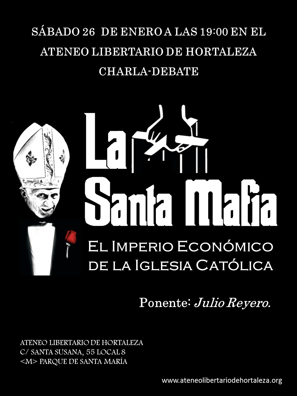 [Sábado 26 de enero] Charla: «La Santa Mafia. El imperio económico de la Iglesia Católica» This entry was posted on 14 de enero de 2013, in Actividades en el Ateneo. Bookmark the permalink. [Sábado 26 de enero – a las 19:00] Charla: «La Santa Mafia. El imperio económico de la Iglesia Católica» Ponente: Julio Reyero Ateneo Libertario de Hortaleza (C/ Santa Susana, 55, local 8 – [M] Parque de Santa María) Comparte esto: Haz clic para compartir en X (Se abre en una ventana nueva) X Haz clic para compartir en Facebook (Se abre en una ventana nueva) Facebook Me gusta Cargando... Relacionado
