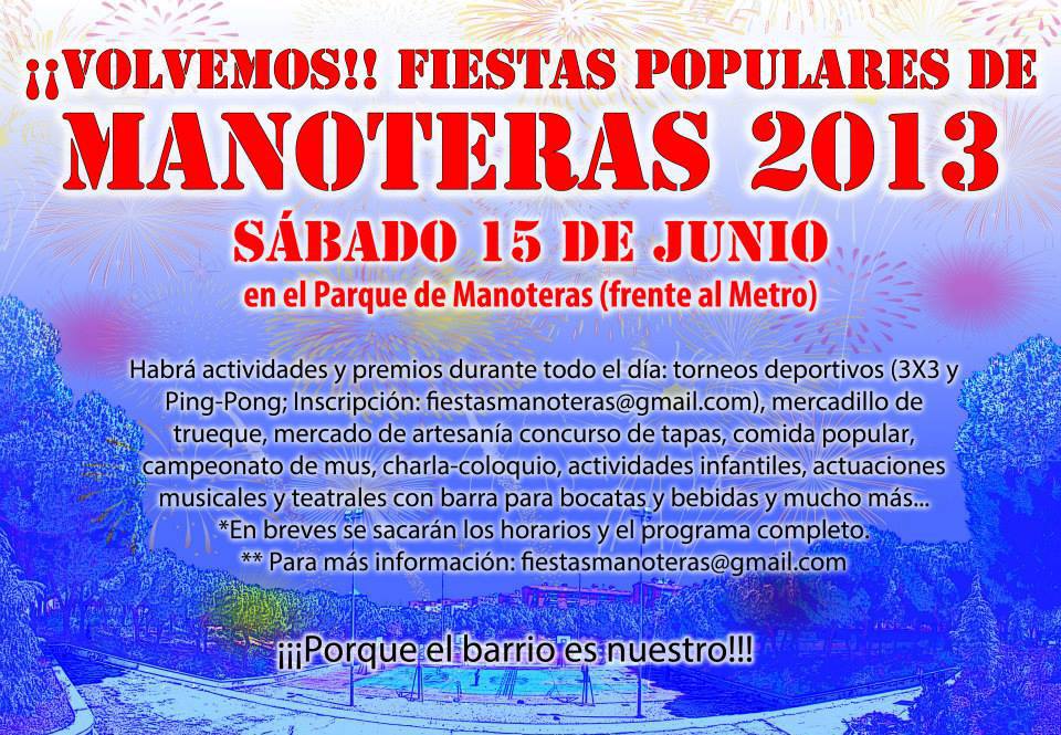 Desde la Asamblea del Nudo de Manoteras, junto con la Asociación Vecinal y otros colectivos del barrio, se pretende recuperar esta tradición tan arraigada que se había perdido en los últimos años debido a los constantes impedimentos del Ayuntamiento, pero que es importante mantener para crear barrio. Porque pese a la crisis, la corrupción y la represión, tenemos derecho a pasarlo bien; y para eso no necesitamos a ninguna Institución. Porque el ocio es una conquista de la clase obrera. Porque la vecindad está despertando y nos enorgullece ser de Manoteras. ¡¡¡Porque el barrio es nuestro!!!