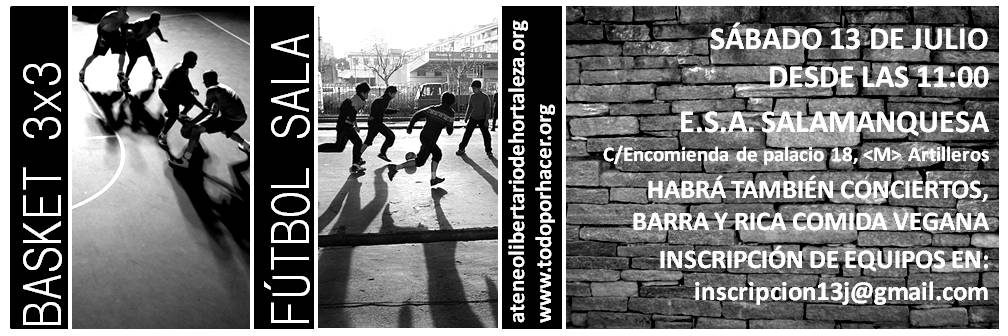 Desde el Ateneo Libertario de Hortaleza estamos organizando en conjunto con los compañeros de la publicación anarquista «Todo por hacer» (http://www.todoporhacer.org/) una fiesta veraniega , que tendrá lugar el día 13 de julio en el E.S.A. Salamanquesa (Calle Encomienda de Palacios 18, <M> Artilleros).