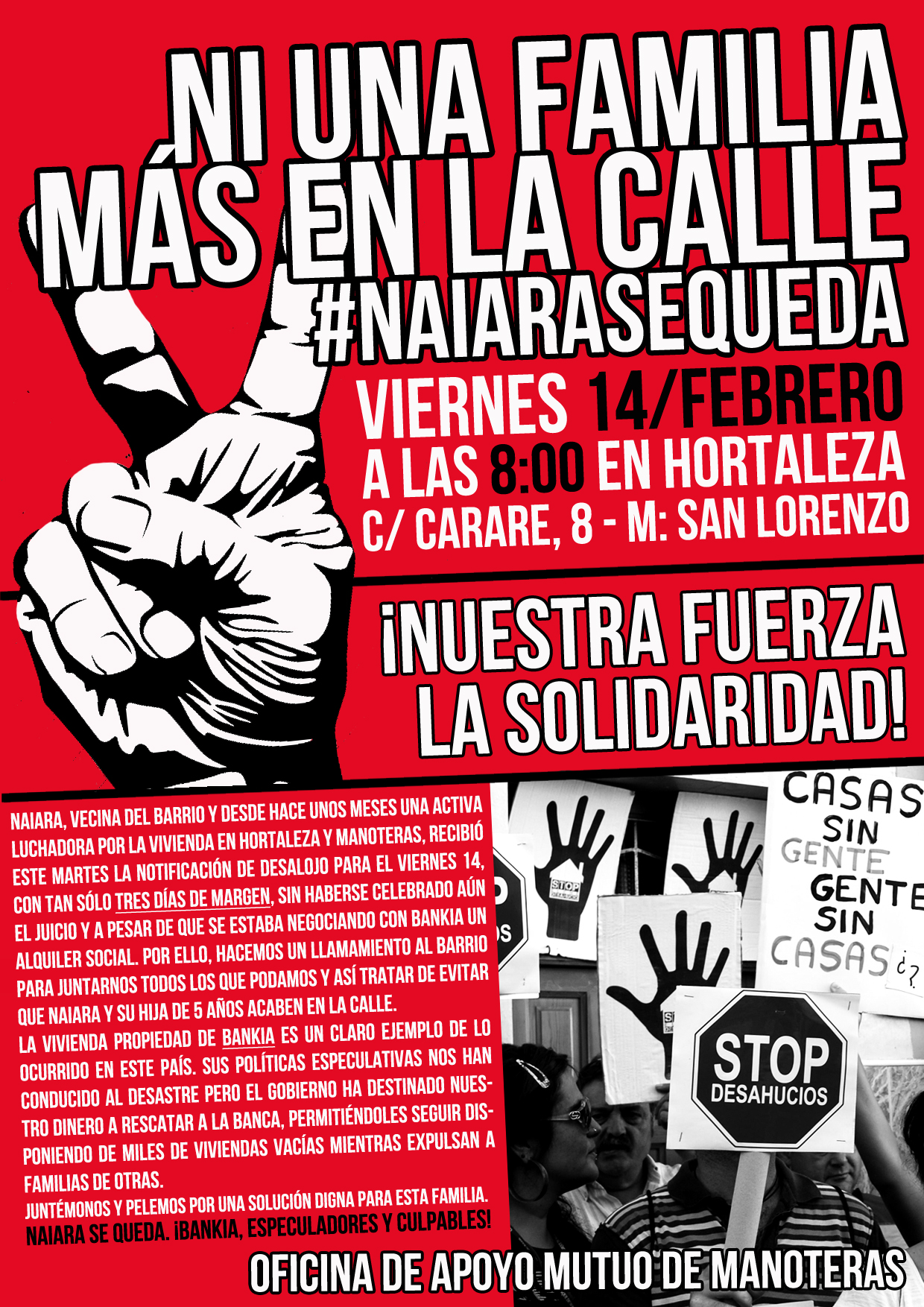 Naiara y su hija de cinco años ya sufrieron hace dos años un desahucio. Ella perdió el trabajo cuando vivían de alquiler y se vieron arrastradas a la calle al no poder pagar las rentas. Como mucha gente que se enfrenta a sus problemas, Naiara y su hija entraron a vivir en un piso vacío propiedad de Bankia. En el mes de octubre la intentaron desalojar por primera vez y gracias al apoyo mutuo de l@s vecin@s logramos paralizar el desalojo antes de que llegara el día del desahucio. Bankia se vió obligada a detener este abuso y a estudiar un alquiler social para Naiara y su hija.
