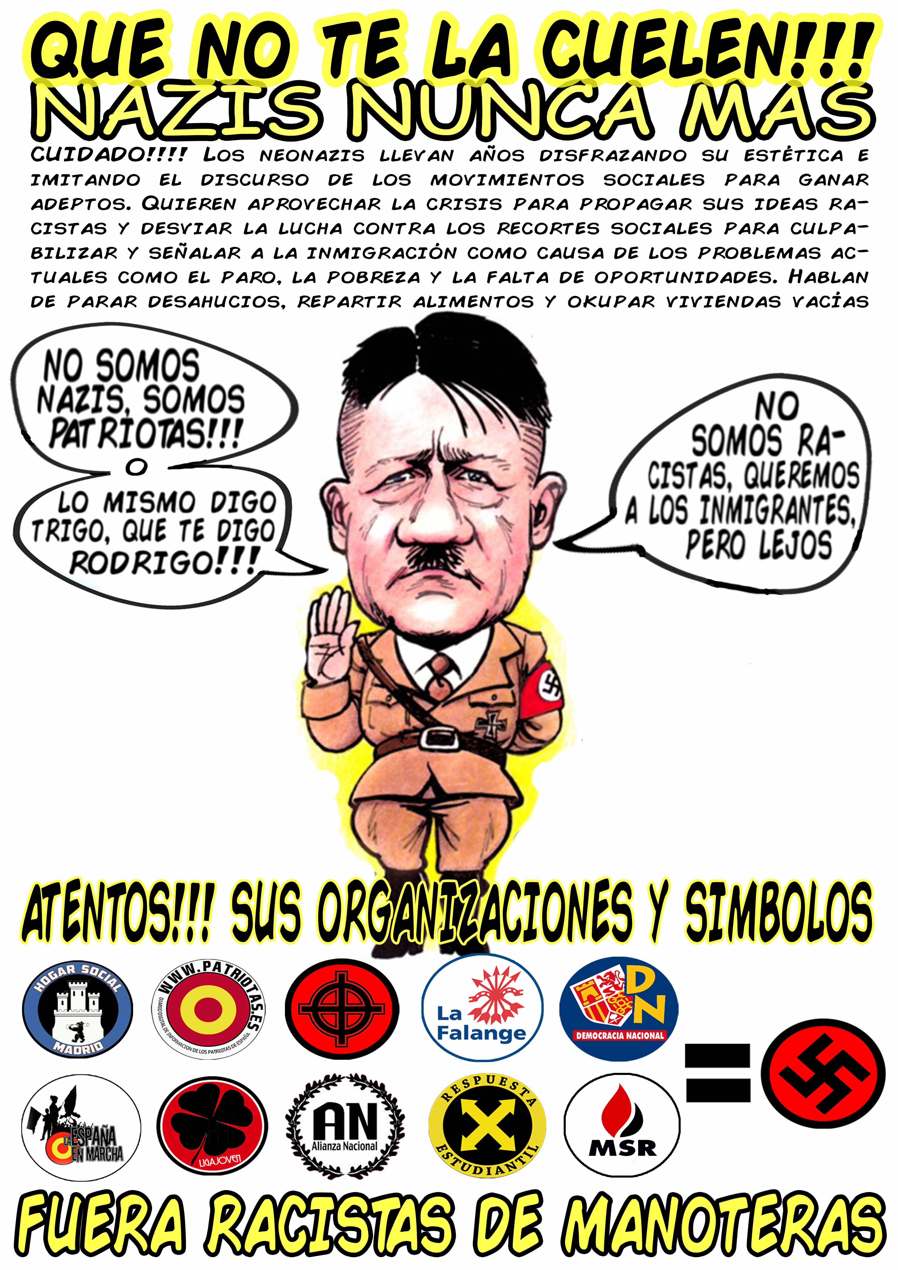 QUE NO TE LA CUELEN!!!!!Campaña informativa sobre la extrema derecha. This entry was posted on 2 de octubre de 2014, in Comunicados and tagged antifascismo, campaña, derecha, extrema, fascismo, informativa, msr, nazis. Bookmark the permalink. Campaña informativa de un grupo de vecinos del barrio preocupados por el auge de grupos de extrema derecha en el barrio. Que no te la cuelen!!!! Comparte esto: Haz clic para compartir en X (Se abre en una ventana nueva) X Haz clic para compartir en Facebook (Se abre en una ventana nueva) Facebook Me gusta Cargando... Relacionado